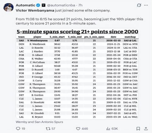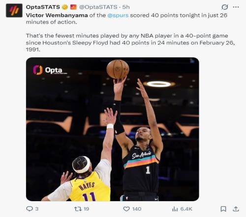 16.文班亞馬拿到第六次40+超越鄧肯,而且比鄧肯少打1236場(chǎng); 17.文班亞馬6次40+追平吉諾比利并列馬刺隊(duì)史第四; 18.文班亞馬不到30分鐘拿到40+歷史第三;