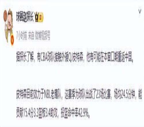第一階段常規(guī)賽打完之后,不少CBA俱樂部都在積極補強外援陣容,很多球隊都把引援方向投向了澳洲NBL聯(lián)賽。據媒體人“球圈趙探長”最新報道:“有CBA球隊接觸外援皮特森,他有可能在本窗口期重返中國?!彪S后就有媒體人透露消息,目前是北控男籃和山東男籃在追逐,但是皮特森接近加盟北控男籃。北控男籃第一階段的成績并不理想,僅僅取得11勝12負聯(lián)盟第十一名的成績,外援陣容中只有里勒能夠真正挑起大梁,在裁掉外援基茲林克之后,北控男籃也急需補強外援陣容。