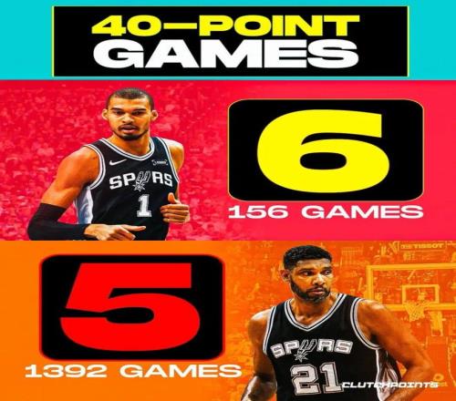 大概是什么概念呢? ——這是文班亞馬生涯第33次30+,超越吉諾比利(32次),升至隊(duì)史第9 ——這是文班亞馬生涯第6次40+,超越鄧肯(5次),升至隊(duì)史第4 大概有人會說,鄧肯、吉諾比利本身也不以得分見長,話是不假,但鄧肯生涯總共打了19個賽季、1392場比賽、總得分26496分,吉諾比利生涯打了16個賽季、1057場比賽、總得分14045分。 文班亞馬只花了不到3個賽季、156場比賽——相當(dāng)于比鄧肯少打了1200+場、比吉諾比利少打了900+場,就分別在這兩項(xiàng)數(shù)據(jù)上超越兩位歷史級名宿,其得分能力絕對是值得肯定的。