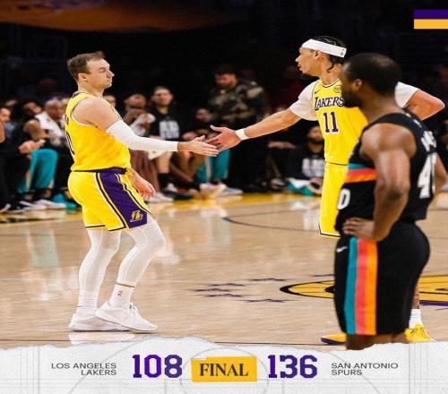 末節(jié)決戰(zhàn),兩隊板凳席末端的球員在場上練兵,比賽早早失去了懸念。布朗尼、哈珀各自帶隊在場上對轟,分差依舊在20分以上,時間逐漸走完。最終,馬刺以136比108完勝湖人,得以斬獲5連勝,紫金軍團則吞下了2連敗。 兩隊數(shù)據(jù) 湖人隊,肯納德8中5得到了14分2板5助、蒂米8中5,三分球3中2得到了14分2板、海斯7中6得到13分4板3助、拉拉維亞6中3得到10分2板1助、克內(nèi)克特8中4得到9分5板1助、巴夫金10中2,三分球5中1得到7分2板1助、八村塁12中3,三分球3中0得到6分4板2助2斷、范德比爾特5中2得到6分4板2助、克萊伯6分3板、尼克史密斯6分2板1助、蒂耶羅3分、馬農(nóng)2分1板1助。 湖人完敗馬刺