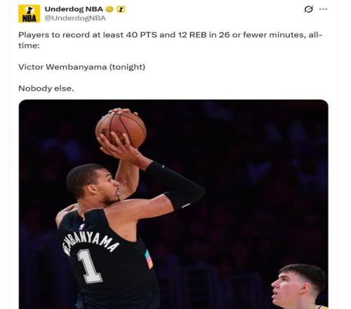 文班亞馬的進攻表現(xiàn)堪稱完美,他在首節(jié)砍下了25分,次節(jié)再得12分。文班亞馬率隊一度取得了41分的領(lǐng)先優(yōu)勢,這也讓其實現(xiàn)了3節(jié)提前打卡。作為此戰(zhàn)的籃板王,文班亞馬率隊在籃板數(shù)據(jù)上以45比34碾壓湖人。并且,文班亞馬送出了全場第二多的搶斷,他在防守端也極具威懾力。需要關(guān)注的是,文班亞馬的正負值高達+22高居全場第三。文班亞馬實現(xiàn)了全方位爆發(fā),打出了絕佳表現(xiàn),他展現(xiàn)了頂級的即戰(zhàn)力。 需要關(guān)注的是,文班亞馬還創(chuàng)下了NBA歷史第1的神跡。數(shù)據(jù)顯示,文班亞馬僅用26分6秒就得到至少40分12籃板,NBA歷史首人。 文班亞馬創(chuàng)下神跡