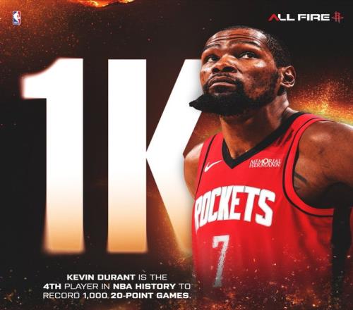 利好三:杜蘭特迎里程碑 讓本場(chǎng)防守含金量進(jìn)一步提升的原因是杜蘭特狀態(tài)不佳,在范喬丹重傷,亞當(dāng)斯報(bào)銷,申京和阿門成長(zhǎng)幅度不佳,烏度卡戰(zhàn)術(shù)調(diào)整能力有限的情況下,杜蘭特本賽季成為火箭隊(duì)兜底的存在。 但本場(chǎng)杜蘭特罕見(jiàn)狀態(tài)不佳,22投僅8中,只有第三節(jié)5中4表現(xiàn)不俗,即便如此,杜蘭特還是拿下26分6板3助3搶斷扛起產(chǎn)量。 憑借這樣的表現(xiàn),杜蘭特迎來(lái)里程碑,成為NBA歷史上第4位拿下千場(chǎng)20+得分表現(xiàn)的球員,前三人分別是詹姆斯、卡爾馬龍和賈巴爾。