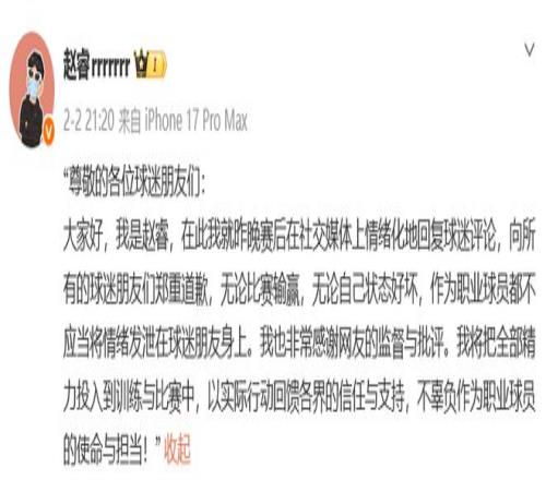 他表示,無論比賽輸贏,無論狀態(tài)好壞,作為職業(yè)球員都不應當將情緒發(fā)泄在球迷朋友身上。非常感謝網友的監(jiān)督與批評,我將把全部精力投入到訓練與比賽中,以實際行動回饋各界的信任與支持,不辜負作為職業(yè)球員的使命與擔當。
