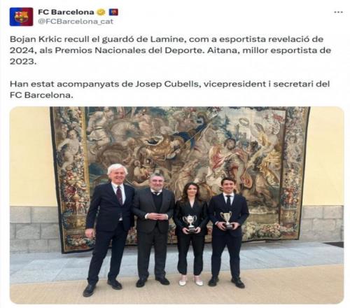2月11報(bào)道 巴薩邊鋒亞馬爾獲得西班牙國(guó)家體育獎(jiǎng)2024年最佳新人運(yùn)動(dòng)員獎(jiǎng),由博揚(yáng)代為領(lǐng)獎(jiǎng)。西班牙國(guó)家體育獎(jiǎng)?lì)C獎(jiǎng)典禮在2026年2月11日進(jìn)行,表彰2023年、2024年的杰出體育成就。亞馬爾2024年表現(xiàn)出色,幫助西班牙國(guó)家隊(duì)贏得歐洲杯冠軍,獲得2024年最佳新人運(yùn)動(dòng)員獎(jiǎng),亞馬爾沒有出席頒獎(jiǎng)典禮,由巴薩足球部門協(xié)調(diào)員博揚(yáng)代為領(lǐng)獎(jiǎng)。 尤文1.1億買庫(kù)普+道路身價(jià)共跌6200萬 加盟不到2年降價(jià)賣