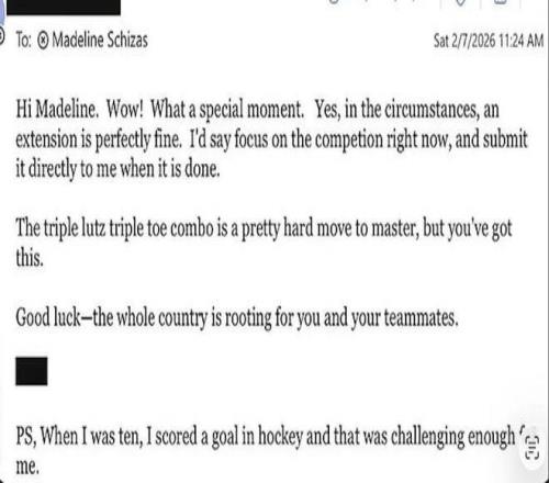 唯恐教授不信,她還貼心地附上了加拿大奧林匹克委員會的一個新聞鏈接,證實(shí)“她確實(shí)在參賽”。 一天后,Schizas便收到了教授的回復(fù),看起來,她遲交作業(yè)的理由確實(shí)足夠硬核。 教授的回信同意了: “嗨,Schizas,哇哦,多么特別的時刻!在這種情況下,延期完全沒問題?!?/p> “我建議你現(xiàn)在先專注于比賽,完成后直接交給我。三周跳接三周跳是個很難掌握的動作,但你一定行的。加油!——全加拿大人民都為你和你的隊(duì)友們打氣!” 末了,教授還不忘補(bǔ)充一句自嘲: “PS:我十歲時在冰球比賽中進(jìn)過一個球,那對我來說已經(jīng)夠有挑戰(zhàn)性了。”