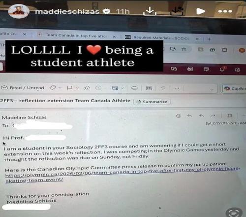 當(dāng)然,她同時也是加拿大安大略省漢密爾頓麥克馬斯特大學(xué)一名在讀大學(xué)生。 上周五,這位專心訓(xùn)練的花滑隊(duì)員突然發(fā)現(xiàn)了一個讓她頗為驚慌的事實(shí): 她剛錯過了一門課的交作業(yè)期限。 原本周五要交的作業(yè),她卻誤以為周日才交。 眼下能做的,就是給教授發(fā)郵件,說明遲交作業(yè)的理由了。 于是她打開電腦寫下了這樣一封郵件: “您好XX教授,我是您社會學(xué) 2FF3 課程的學(xué)生,想詢問是否可以對本周的作業(yè)申請短暫延期。 我昨天正在參加冬奧會的比賽,以為作業(yè)截止期是周日,沒想到是周五……”