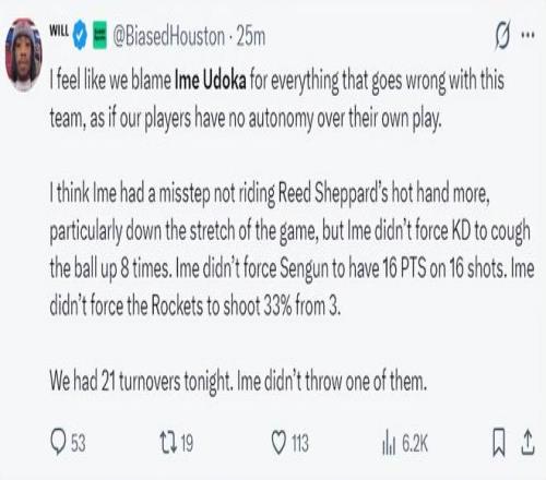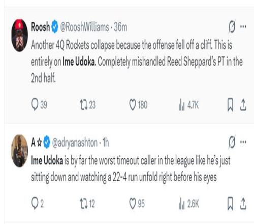 休斯頓記者:火箭又在末節(jié)輸球,原因是末節(jié)進(jìn)攻嚴(yán)重下滑,這都是因為烏度卡導(dǎo)致的,他在末節(jié)給謝潑德的戲份太少。 休媒:烏度卡無疑是聯(lián)盟最糟糕的使用暫停教頭之一,他總是傻呆呆的站著看著球隊被打22-4。