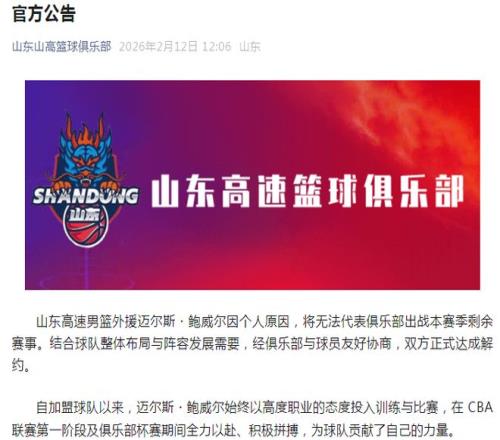 山東男籃官方公告宣布雙方友好解約,具體內(nèi)容如下: 山東男籃外援鮑威爾因個(gè)人原因,將無(wú)法代表俱樂(lè)部出戰(zhàn)本賽季剩余賽事。結(jié)合球隊(duì)整體布局與陣容發(fā)展需要,經(jīng)俱樂(lè)部與球員友好協(xié)商,雙方正式達(dá)成解約。