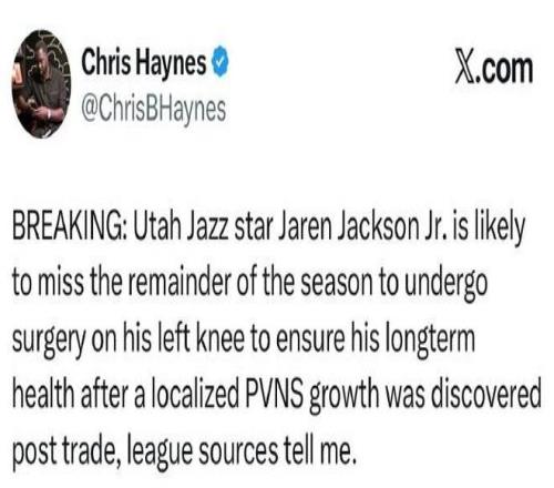 只是如今根據(jù)名記Haynes報(bào)道,賈倫-杰克遜在交易后,就被發(fā)現(xiàn)左膝出現(xiàn)局部色素沉著絨毛結(jié)節(jié)性滑膜炎增生。為確保賈倫-杰克遜的長期健康,他將接受手術(shù),從而缺席本賽季剩余比賽提前賽季報(bào)銷。 爵士隨后官宣確認(rèn)賈倫-杰克遜將接受手術(shù),切除左膝一處局部色素沉著絨毛結(jié)節(jié)性滑膜炎(PVNS)增生組織。該增生組織是在交易后體檢中通過核磁共振成像發(fā)現(xiàn)的。經(jīng)與多位醫(yī)學(xué)專家會(huì)診協(xié)商,賈倫-杰克遜本人、其經(jīng)紀(jì)團(tuán)隊(duì)及爵士決定,在未來幾天的NBA全明星周末期間進(jìn)行手術(shù),預(yù)計(jì)他將完全康復(fù)。