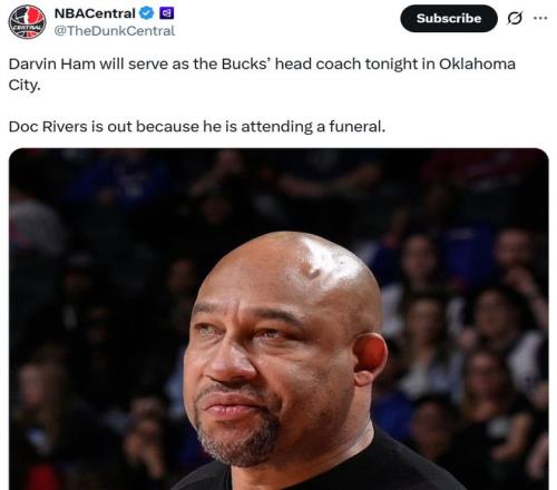 哈姆臨危受命 值得一提的是,本場(chǎng)比賽雄鹿隊(duì)不僅是殘陣,甚至連主帥里弗斯也缺席。 賽前采訪時(shí),雄鹿助教哈姆公開表示球隊(duì)主帥道格-里弗斯因參加葬禮而缺席本場(chǎng)比賽,自己將在本場(chǎng)擔(dān)任雄鹿臨時(shí)主教練。 “大家好,我是達(dá)文漢姆——道格-里弗斯的替身”哈姆在采訪中開玩笑般說道。