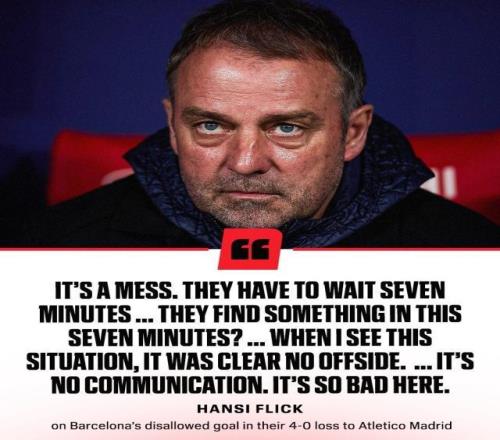 同時,這也是弗利克執(zhí)教生涯第二次在上半場丟掉4球,第一次發(fā)生在2005年3月的德國第四級別聯(lián)賽:奧芬巴赫踢球者4比1霍芬海姆(最終比分6比2)。作為德國國家隊主帥,他最慘痛的失敗是在友誼賽1比4負于日本,這場敗仗最終導致他丟掉了工作。0比4馬競,是弗利克執(zhí)教生涯最慘痛的失利。 《每日體育報》賽后評論道:“西蒙尼的球隊與巴薩最明顯的區(qū)別不在于戰(zhàn)術,而在于求勝的渴望。馬競一開場便展現(xiàn)出頑強拼搏的精神,斗志昂揚,而巴薩則仿佛在散步,懶散得令人不齒……事實上,巴薩上半場連丟4球絕非偶然,這并非‘運氣不好’所致,而是因為缺乏競爭精神、缺乏斗志、心不在焉。 “沒錯,巴薩有可能在國王杯中被淘汰。但這固然嚴重,卻幾乎是次要的。真正令人擔憂的是球隊展現(xiàn)出的形象。他們在公眾面前暴露了自己的弱點,而我們在大都會球場目睹的一切,似乎表明球隊的缺陷遠比我們想象的要多得多,也更加根深蒂固?!弊詈笤搱笳J為:“次回合巴薩將回到主場諾坎普,但足球場上的奇跡越來越少見。如果弗利克能夠扭轉頹勢,讓球隊在剩余的聯(lián)賽和歐冠比賽中保持競爭力,那就已經(jīng)算是成功了?!?/p> 賽后弗利克表示:“他們(馬競)更強大,也更渴望進球。今天沒有任何借口,但我們會卷土重來?!彼WC,“一切尚未定論。我們需要所有巴薩球迷來到我們的球場,我們將戰(zhàn)斗90分鐘,力爭晉級決賽。我們渴望贏得冠軍。” 巴薩上半時0比4落后確實沒有借口,但下半時庫巴西的進球被裁判吹掉,還有朱利亞諾·西蒙尼飛鏟巴爾德——他的防區(qū)本場被屢次打爆——沒有吃到紅牌,也著實讓巴薩人意難平。第52分鐘,亞馬爾從右側開出戰(zhàn)術任意球,費爾明在禁區(qū)前沿推射,皮球在禁區(qū)內經(jīng)過連續(xù)碰撞后,最終由庫巴西補射破門,然后經(jīng)過了長達6分鐘的視頻回看后,主裁判最終宣布巴薩進球無效。