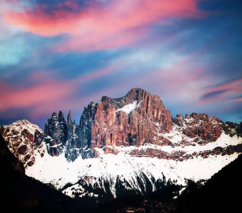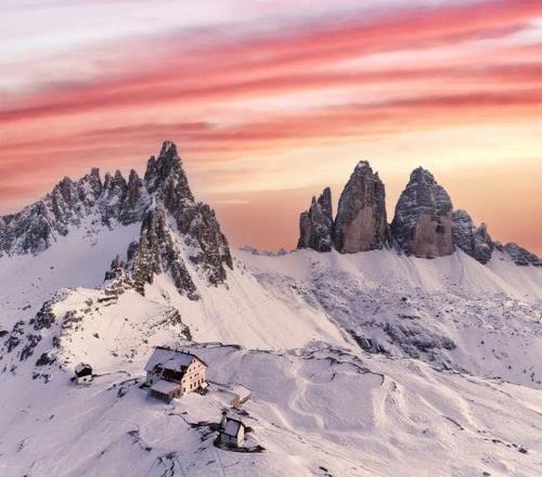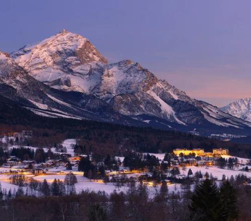 理解科爾蒂納為何成為滑雪圣地,必須從認(rèn)識多洛米蒂開始。這片山脈以18世紀(jì)法國地質(zhì)學(xué)家德奧達(dá)·德·多洛米厄命名,其獨(dú)特的白云巖構(gòu)成了它標(biāo)志性的淺色肌理,在日光下宛如“蒼白山脈”。然而,自然的魔法在晨昏上演:當(dāng)太陽光線低角度掠過,整片山體會被瞬間“點(diǎn)燃”,從柔和的粉金色漸變?yōu)闊肓业幕鸺t。這場每日兩次的光影戲劇,被當(dāng)?shù)厝朔Q為 “Enrosadira”,阿爾卑斯夕照,也讓這里的每一次滑行,都能邂逅粉金霞光相伴的浪漫。