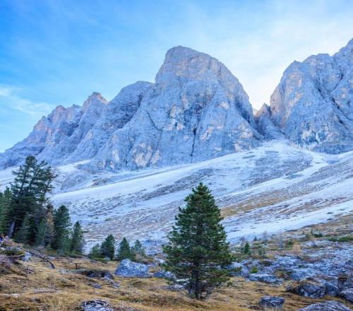 帶上雪板,也別忘了在行囊里塞一雙徒步鞋。科爾蒂納還是有名的徒步圣地。富內(nèi)斯山谷常被視作起點(diǎn)。站在圣瑪格達(dá)萊納小鎮(zhèn),視線自然會被身后的蓋斯勒群峰牽引,巖壁如尖塔般直指天空,而前景卻是緩緩展開的草甸、木屋與教堂,這一幕被譽(yù)為“阿爾卑斯山最美的明信片”。然而,本地傳說給這幅美景賦予了奇幻的底色:相傳這里的王國曾毀于戰(zhàn)火,是土撥鼠從黑暗中救出了幸存者,因此土撥鼠被視為感恩的象征,徒步途中偶遇探頭探腦的土撥鼠,便成了山谷贈予行者的第一份溫柔邂逅。