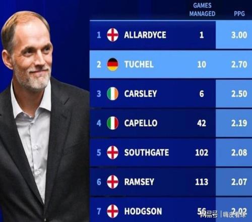 去年初,圖赫爾正式上任,接替李·卡斯利,擔(dān)任英格蘭的正式主帥。隨后的世界杯預(yù)選賽中,英格蘭豪取8連勝,不僅成為歐洲區(qū)唯一提前兩輪晉級(jí)世界杯的球隊(duì),而且8場(chǎng)比賽不失1球,不愧為預(yù)選賽之王。同時(shí),英格蘭還創(chuàng)造了一個(gè)似乎難以被打破的紀(jì)錄,過(guò)去五屆世界杯預(yù)選賽,合計(jì)取得連續(xù)39場(chǎng)不敗。 8場(chǎng)預(yù)選賽,加上2場(chǎng)非正式比賽,圖赫爾僅在友誼賽負(fù)于塞內(nèi)加爾,也是唯一有失球的比賽。統(tǒng)計(jì)表明,10場(chǎng)9勝,場(chǎng)均2.7分,是英格蘭所有主帥中第二高的,僅次于只帶隊(duì)一場(chǎng),就因?yàn)槌舐劧抡n的阿勒代斯。其實(shí),前任卡斯利場(chǎng)均得分也能排在第三名,也不算太差,隨后包括卡佩羅、索斯蓋特等熟悉的名字。
