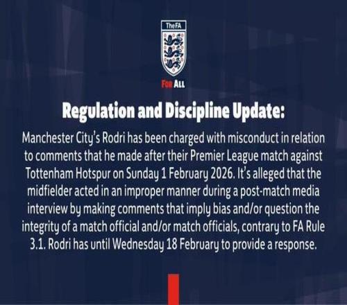羅德里因在2026年2月1日與熱刺的英超比賽后發(fā)表的言論而被指控行為不當(dāng),據(jù)稱,他在賽后媒體采訪中發(fā)表了暗示偏見和/或質(zhì)疑比賽官員和/或比賽官員公正性的言論,這違反了英足總規(guī)則3.1,羅德里需在2月18日之前作出回應(yīng)。(公告完) 【上咪咕獨(dú)家看英超】 |