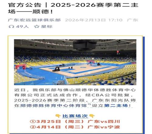 根據(jù)廣東宏遠(yuǎn)籃球俱樂部發(fā)布的消息,在常規(guī)賽第二階段他們將啟用本賽季的第二個(gè)主場,順德德勝體育中心體育館,本賽季廣東隊(duì)在這個(gè)球館的比賽只有兩場,分別是3月25日廣東主場對陣四川隊(duì)的比賽,以及4月14日廣東對陣寧波隊(duì)的比賽,其余的主場比賽依舊在東莞東風(fēng)日產(chǎn)問文體中心體育館。
