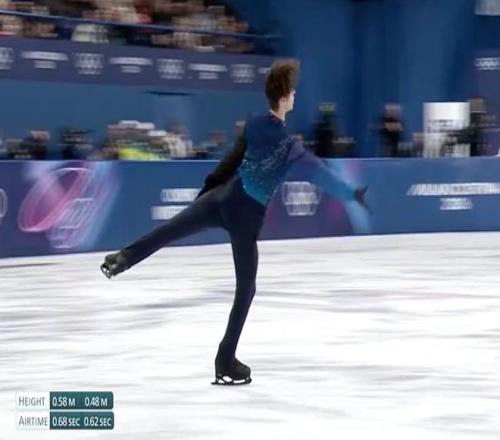 米哈伊爾·沙伊多羅夫三周跳接四周跳 即使沒那么懂花樣滑冰的復(fù)雜評分規(guī)則,我們也能在觀賞高難度動作時獲得心跳加速,四周跳躍就是其中之一。 這些高難度跳躍各自都有復(fù)雜的技術(shù)動作,不過它們也遵循著同一套基本的物理學(xué)規(guī)律。從力學(xué)的角度來看,花樣滑冰四周跳的奇跡是怎樣實(shí)現(xiàn)的呢? 起跳:高度和旋轉(zhuǎn)的絕妙平衡 要想在空中完成多周旋轉(zhuǎn),運(yùn)動員必須為自己爭取足夠長的空中時間,并獲得足夠大的旋轉(zhuǎn)動力,這兩點(diǎn)都由蹬冰起跳的動作決定。 起跳瞬間垂直向上的速度決定了跳躍高度,同時也決定了滯空時間。高水平運(yùn)動員在起跳時垂直速度更大,這讓他們能在空中停留更久,有時間轉(zhuǎn)完更多圈數(shù)。頂尖花滑選手能達(dá)到的最大騰空時間大約在0.7秒左右[1]。