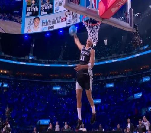 卡特-布萊恩特決賽第一扣從右側(cè)弧頂啟動(dòng),拋球到籃下加速起飛高高躍起,接反彈球完成胯下?lián)Q手側(cè)身暴扣,由于難度更高獲得滿(mǎn)分50分,也是今年扣籃大賽首個(gè)滿(mǎn)分扣籃。