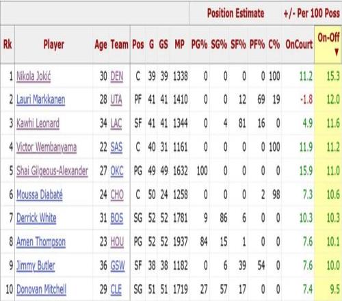 排在榜單第一位的,是來(lái)自丹佛掘金的尼古拉-約基奇,他的ON-OFF值高達(dá)15.3,斷崖式領(lǐng)先第二名。約老師本賽季場(chǎng)均貢獻(xiàn)28.7分(聯(lián)盟第七)12.3籃板(聯(lián)盟第一)10.7助攻(聯(lián)盟第一),就沖著這場(chǎng)均三雙的成績(jī)單,就知道他的不一般,現(xiàn)役最強(qiáng)單體豈是浪的虛名。不過(guò),在約基奇因傷缺席的16場(chǎng)比賽中,掘金取得了10勝6負(fù),以穆雷為首的其他球員其實(shí)戰(zhàn)斗力不俗,但只要約老師回歸,全隊(duì)就會(huì)不由自主地對(duì)約基奇產(chǎn)生依賴(lài),這也是很有意思的一點(diǎn)。