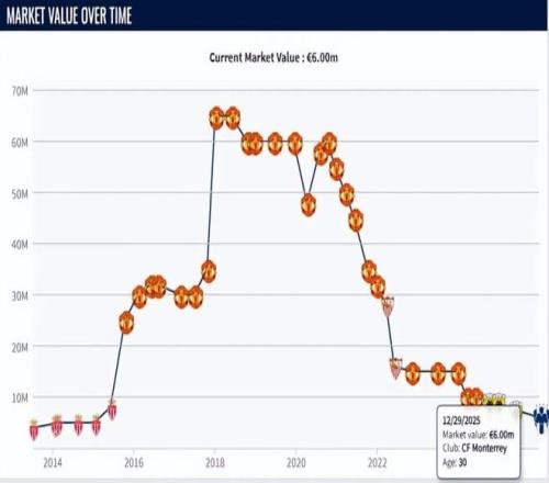 其中2015年6000萬買入的馬夏爾,堪稱是“古早版”失敗者。自摩納哥出道后他來到曼聯(lián)的,起初表現(xiàn)還算穩(wěn)定,到2018年前后身價到過6500萬的高度的??蛇z憾的是之后他再無太好的機會,2020年前后則遭遇到了崩盤,身價一落千丈的。到2022年只有3000萬不到。