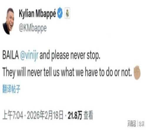 北京時(shí)間2月18日,歐冠淘汰賽附加賽首回合,皇馬客場(chǎng)1-0擊敗本菲卡,維尼修斯進(jìn)球后跳舞慶祝,疑似遭到本菲卡的阿根廷前鋒普雷斯蒂亞尼的種族歧視,對(duì)此,姆巴佩全力支持自己的隊(duì)友!