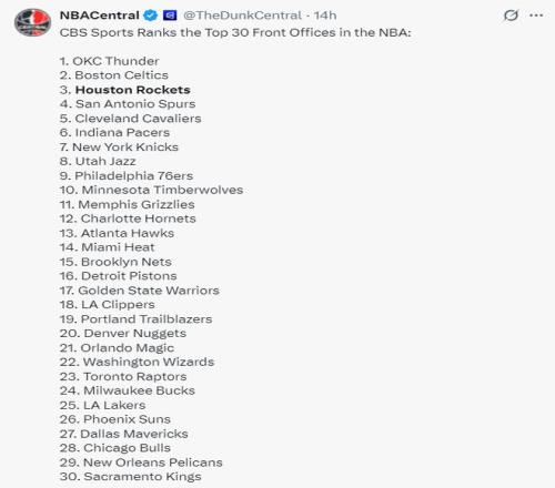 北京時間2月18日,CBS公布了聯(lián)盟30支球隊的管理層排名,雷霆第一、綠凱第二、火箭第三、馬刺第四、騎士第五。