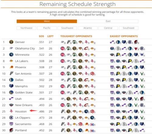 全明星周末后火箭隊29天里要打完52場比賽,其中有6次背靠背,但火箭余下這29場比賽平均勝率48.6%,面對季后賽區(qū)內(nèi)的球隊:馬刺1場、掘金1場、尼克斯2場、湖人2場、森林狼2場、猛龍1場。