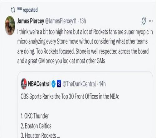 火箭記者James Piercey寫道:很多人覺得斯通的排名過高了,很多火箭球迷對斯通的每一個舉動都進行微觀的分析,他們一直都在關(guān)注火箭隊,斯通在各個方面都頗受尊重,而且你們對比一下其他球隊的總經(jīng)理,你就會發(fā)現(xiàn)斯通是一位非常出色的GM。