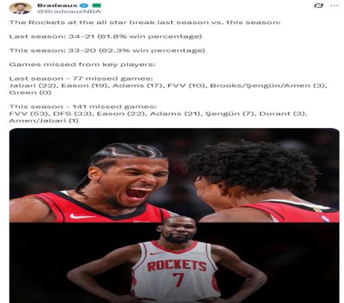 休媒Bradeaux曬出火箭隊本賽季與上賽季全明星周末前的戰(zhàn)績,本賽季火箭隊在多位核心合計傷缺141場(比上賽季多64場)的情況下勝率還略高一些(62.3%-61.8%)。