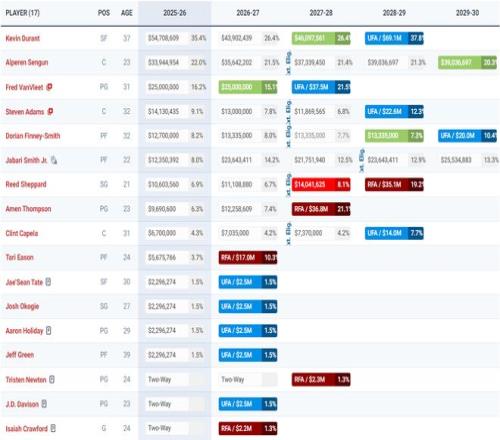 火箭隊在今夏交易得到了凱文-杜蘭特、卡佩拉,簽下了自由球員芬尼-史密斯,除此之外還續(xù)約了杰夫-格林、亞當斯、范弗利特、泰特、霍勒迪等多人,這讓火箭隊成為了奪冠熱門之一,只可惜范弗利特、亞當斯早早賽季報銷。
