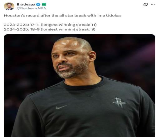 休媒還曬出烏度卡23-24賽季在全明星周末后17勝11負,24-25賽季則是18勝9負,自他加盟火箭隊全明星周末后戰(zhàn)績都在不斷攀升。