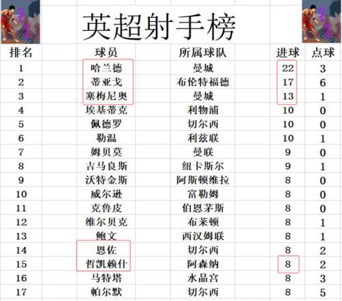 射手榜方面,哈蘭德22球繼續(xù)領(lǐng)跑,蒂亞戈5球之差位列第2,塞梅尼奧13球排在第3。哲凱賴什今天未能進(jìn)球,還是和沃特金斯,維爾貝克,恩佐,帕爾默等人8球剛好擠入前十。 |