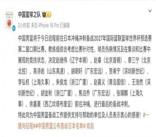 中國(guó)男籃最新名單!徐杰和龐崢麟無(wú)緣!14人出征日本