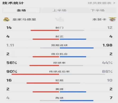 全場(chǎng)比賽,本菲卡的預(yù)期進(jìn)球(xG)高達(dá)1.98,而皇馬只有1.11。本菲卡創(chuàng)造了更多的絕佳機(jī)會(huì),射門數(shù)12-14并不落下風(fēng),甚至在第60分鐘由拉法·席爾瓦完成了一腳擊中橫梁的射門——如果這球進(jìn)了,皇馬大概率已經(jīng)回家釣魚(yú)了。