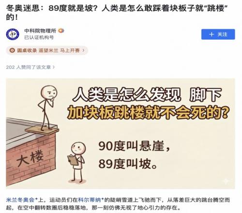 知乎答主塔塔pro指出,這件事的核心爭議不在于技術(shù),而在于象征意義的剝奪:作為美國白人男性,他在動(dòng)作解禁后迅速搶占這一曾屬于黑人女性的反抗符號(hào),被指抹殺了包娜麗在禁忌年代賦予它的歷史重量。美國媒體以“首個(gè)合法完成者”高調(diào)宣傳,更被批帶有種族傲慢——以“合法”淡化過往的“非法”,無形中消解了包娜麗當(dāng)年在規(guī)則之外留下的勇氣印記。 在種族敏感的社會(huì)語境下,這被視為白人對少數(shù)族裔稀缺榮光的文化擠壓。馬里寧選擇后空翻而非4A,既有視覺傳播的考量,也折射出商業(yè)推廣中對符號(hào)價(jià)值的實(shí)用主義取舍。 這種剝離表面看熱鬧、直擊底層邏輯的內(nèi)容,正是知乎在奧運(yùn)報(bào)道中展現(xiàn)出的“不一樣”。 89度就是坡?人類是怎么敢踩著塊板子就“跳樓”的!面對這個(gè)“人類怎么敢踩著板子跳樓”的冬奧迷思,引得了中科院物理所的親自下場科普:運(yùn)動(dòng)員以高速撞向地面,速度在千分之幾秒內(nèi)降為零,作用時(shí)間極短,沖擊力會(huì)瞬間爆表——這就是為什么“90度叫懸崖”,跳下去必死無疑。 但冬奧賽場的設(shè)計(jì)師們早就算好了這筆賬。他們根據(jù)運(yùn)動(dòng)員的飛行軌跡,將著陸坡坡度精確設(shè)計(jì)在37°到40°之間——這恰好與運(yùn)動(dòng)員拋物線軌跡的落點(diǎn)角度完美吻合。這就是為什么“89度叫坡”——只要差一度,從“致命”變成“可行”。 用一個(gè)更好理解的語言便是:這就像你從樓梯上跳下——如果落在斜坡上,你可以順勢跑下去,沖擊被“稀釋”在每一步中;如果落在平地上,膝蓋就要承受全部沖擊。
