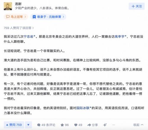 這個(gè)故事來自于一位體育記者連耐在知乎上的回憶。他稱寧忠?guī)r是一個(gè)非常踏實(shí)的人,“他基本上有什么說什么,說不上來會(huì)想辦法組織語言”,以及還有一個(gè)特性,英語非常好,面對國際冰聯(lián)的采訪,用英語侃侃而談,口語和聽力基本沒什么障礙。 連耐回憶了當(dāng)時(shí)的情形:后來媒體都散了,就剩下我倆了,我說你英語怎么這么好?怎么練的?他說是自己報(bào)了一個(gè)班上網(wǎng)課,一對一訓(xùn)練,從零開始學(xué)習(xí)。那是2024年11月,他已經(jīng)學(xué)了一年多了,進(jìn)步很快,跟老外交流沒什么問題?!八f隊(duì)里對外語沒有要求,是自己要學(xué)的,因?yàn)榻?jīng)常出國訓(xùn)練,所以覺得英語是一項(xiàng)必備的技能”。 當(dāng)四年沒有參加大跳臺(tái)項(xiàng)目的谷愛凌獲得了該項(xiàng)目銀牌時(shí),知乎平臺(tái)上最受關(guān)注的內(nèi)容不是對谷愛凌一味的吹捧或貶低,而是對她為何四年沒有跳過大跳臺(tái),復(fù)出就能奪銀的詳細(xì)探析。 答主蘇林深分析道,嚴(yán)格來說谷愛凌并非四年沒有練習(xí),而是沒參加過大跳臺(tái)比賽。同時(shí)他還指出,大跳臺(tái)本身就是坡面障礙技巧比賽內(nèi)容的一部分,大跳臺(tái)和坡障還共享注冊池、共用積分池、共用奧運(yùn)資格。 而當(dāng)聊到本屆爭議頗大的中國短道速滑隊(duì)教練張晶時(shí),知友們則從兩個(gè)完全不同的角度形成激烈的交鋒: 答主可達(dá)鴨高屋建瓴的認(rèn)為,短道隊(duì)?wèi)?zhàn)績不佳和教練關(guān)系不大,主要是因?yàn)橹袊F(xiàn)在短道隊(duì)在選材層面上出現(xiàn)了變革:雖然整體資金更多,很多以往的弱省也參與進(jìn)了冬奧人才的選拔,但這事實(shí)上反而攤薄了更擅長冰雪項(xiàng)目選材的黑龍江與吉林的資源,導(dǎo)致目前人才斷檔,教練換誰來都無能為力。這篇回答在知乎得到了超過1000的點(diǎn)贊,是站內(nèi)得到支持最多的觀點(diǎn)。 但知乎相對其他平臺(tái)最大的優(yōu)勢可能就是觀點(diǎn)交鋒。針對這個(gè)看法,答主龔力提出了幾乎完全相反的意見。 龔力以男女隊(duì)最近一個(gè)周期的梯隊(duì)建設(shè)切入,從張晶此前執(zhí)教匈牙利的經(jīng)歷開始,細(xì)致的對張晶過去一整個(gè)周期對中國隊(duì)的執(zhí)教做了回顧,用大量的細(xì)節(jié)勾勒了他眼中最近四年中國短道速滑隊(duì)的變化,并得出了非常大膽犀利的結(jié)論:張晶執(zhí)教水平不足,用人不當(dāng),她和支持她的團(tuán)體應(yīng)該對短道速滑隊(duì)這個(gè)周期的失敗負(fù)主要責(zé)任。 雖然在業(yè)內(nèi)人士看來,這樣兇猛的結(jié)論或許缺少足夠的證據(jù)支撐。但從某種意義上來看,正是這種位置上的不同,讓知乎答主們或許比知道內(nèi)情的記者和從業(yè)者更敢于發(fā)聲。 而他們的觀點(diǎn)也往往比業(yè)內(nèi)人士九曲十八彎的表達(dá)更能擊中人心——在知乎的官方微博上,近9000人為這個(gè)回答點(diǎn)贊,單篇閱讀量超過50萬,大量用戶表示“知乎真的有東西”“力挺知乎”。