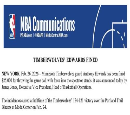 北京時(shí)間2月27日,NBA籃球運(yùn)營執(zhí)行副總裁詹姆斯-瓊斯今日宣布,森林狼后衛(wèi)愛德華茲和魔術(shù)后衛(wèi)貝恩都因用力將比賽用球扔向觀眾席,各被罰款25000美元。