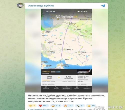 然而,這條航線讓他與戰(zhàn)爭有了一次擦肩而過的交集。"我們離開迪拜時心想:'如果上帝允許,這趟飛行會平安無事。'"布勃利克在自己的Telegram頻道上回憶道,"我們才剛飛離伊朗領(lǐng)空,我就看了新聞,目睹了發(fā)生的一切。" 他沒有夸張。就在他的航班剛剛離開伊朗空域不久,美國與以色列對伊朗境內(nèi)目標(biāo)發(fā)動了打擊,而伊朗迅速向包括阿聯(lián)酋在內(nèi)的多個海灣國家發(fā)射了導(dǎo)彈作為報復(fù)。事后公布的飛行追蹤圖像顯示,布勃利克的航班幾乎是"掐著點(diǎn)"離開了危險區(qū)域——如果晚半小時,他很可能會被迫返航,甚至在空中經(jīng)歷更驚魂的時刻。