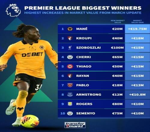 英超身價(jià)漲幅榜:索博斯洛伊上漲1500萬(wàn)歐達(dá)1億,謝爾基上漲1500萬(wàn)歐