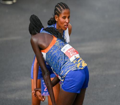2026年3月15日,上海,獲得女子組冠亞軍的兩位外國選手握手慶祝。澎湃新聞記者 朱偉輝 圖 而在本周五的賽前發(fā)布會上,金標(biāo)跑者基普肯博伊獲贈一把印有浦東城市天際線的檀香扇。他很喜歡這份禮物,同時也透露選擇來這兒參賽的主要原因是“它(指上海半馬)在國際跑者中有不錯的口碑?!鄙像R組委會的官方數(shù)據(jù)顯示,今年的上海半馬迎來包括泰國、日本和美國在內(nèi)的60個國家和地區(qū)的跑者,其實每一年的上海半馬,都像是一場全世界跑者的大聚會。