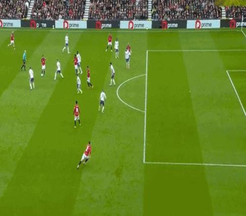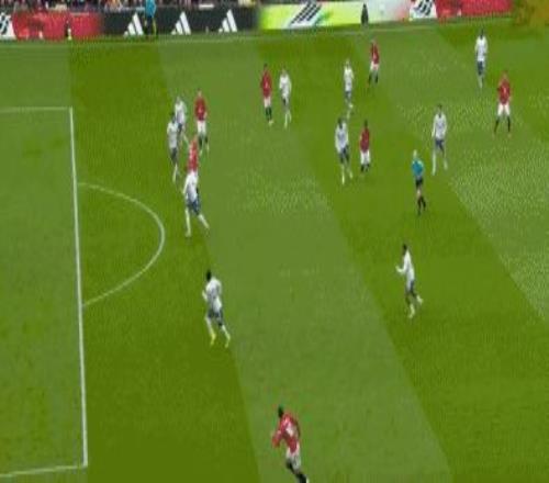 第38分鐘,曼聯(lián)球員B費(fèi)禁區(qū)前沿過(guò)頂長(zhǎng)傳,達(dá)洛特右路插上,停球之后起腳勁射,皮球高出橫梁。