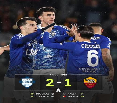 人數(shù)占優(yōu)的科莫隨即展開(kāi)猛烈進(jìn)攻。第79分鐘,達(dá)庫(kù)尼亞右路突破后倒三角回傳,斯莫西奇第一腳射門被斯維拉爾撲出,但皮球落到門前的迭戈·卡洛斯腳下,后者開(kāi)心撿漏補(bǔ)射再下一城,科莫2-1首次反超羅馬。 最終比分也定格在此。這樣一來(lái),羅馬客場(chǎng)慘遭翻盤,連續(xù)三場(chǎng)客場(chǎng)未嘗勝績(jī)。與此同時(shí),科莫?jiǎng)t憑著這場(chǎng)逆轉(zhuǎn),殺入意甲積分榜第四。這支黑馬球隊(duì)的歐冠夢(mèng)想似乎正一步步變成現(xiàn)實(shí)。