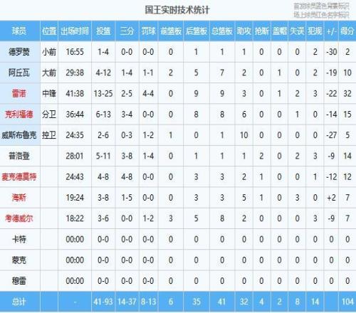 國王:雷諾32分9板3助、克利福德15分8板6助、普洛登14分1板1助2斷、麥克德莫特12分3板2助、阿丘瓦10分7板2助、考德威爾7分8板2助、海斯7分3板5助、威斯布魯克5分1板10助 馬刺:文班亞馬18分8板3助、凱爾登18分1板1助、尚帕尼17分1板1助、巴恩斯16分4板3助、??怂?5分5板6助、哈珀15分4板5助、沃特斯11分4板2助、布萊恩特7分3板2助