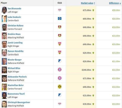 1、揚-迪奧曼德(萊比錫) 上漲3000萬歐至7500萬歐 2、武什科維奇(漢堡) 上漲2000萬歐至6000萬歐 3、科法內(nèi)(勒沃庫森) 上漲1800萬歐至4000萬歐 4、馬扎(勒沃庫森) 上漲1500萬歐至4000萬歐 4、萊韋林(斯圖加特) 上漲1500萬歐至4000萬歐 4、亨德里克斯(斯圖加特) 上漲1500萬歐至2000萬歐 7、布格爾(霍芬海姆) 上漲1100萬歐至2000萬歐 8、奧利塞(拜仁) 上漲1000萬歐至1.4億歐 8、帕夫洛維奇(拜仁) 上漲1000萬歐至7500萬歐 8、拜爾(多特) 上漲1000萬歐至4000萬歐 8、巴祖馬納-杜爾(霍芬海姆) 上漲1000萬歐至3500萬歐 8、鮑姆加特納(萊比錫) 上漲1000萬歐至3000萬歐 |