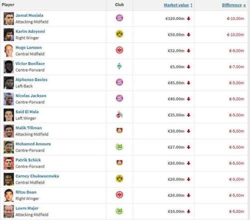1、穆西亞拉(拜仁) 下跌1000萬歐至1.3億歐 1、阿德耶米(多特) 下跌1000萬歐至5000萬歐 3、胡戈-拉松(法蘭克福) 下跌800萬歐至3200萬歐 4、博尼費斯(不萊梅) 下跌700萬歐至500萬歐 5、阿方索-戴維斯(拜仁) 下跌500萬歐至4500萬歐 5、雅克松(拜仁) 下跌500萬歐至4000萬歐 5、賽義德-馬拉(科隆) 下跌500萬歐至3500萬歐 5、蒂爾曼(勒沃庫森) 下跌500萬歐至3000萬歐 5、阿穆拉(沃爾夫斯堡) 下跌500萬歐至2700萬歐 5、???勒沃庫森) 下跌500萬歐至2000萬歐 5、丘庫埃梅卡(多特) 下跌500萬歐至2000萬歐 5、堂安律(法蘭克福) 下跌500萬歐至2000萬歐 5、馬耶爾(沃爾夫斯堡) 下跌500萬歐至1000萬歐 |
