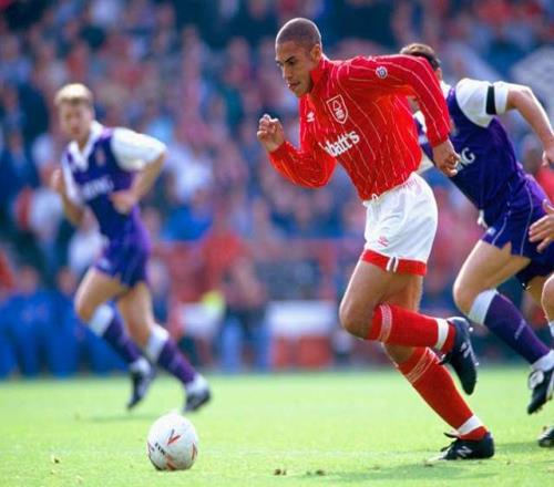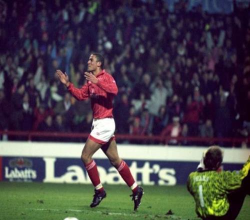賽季結(jié)束,激動的球迷把他像英雄一樣抬下場,球衣球鞋都被扒光了當紀念品。那一刻,科利莫爾第一次感受到了被需要的滋味。他說:“我只待了6個月,但感覺棒極了?!?/p> 這短暫的“國王”體驗,讓他嘗到了甜頭,也為他日后無法接受替補和批評埋下了伏筆。 諾丁漢的“人形炮臺”與安菲爾德的標王 在紹森德打出身價后,剛剛從英超降級的諾丁漢森林砸出200萬英鎊將他簽下。這筆錢,比一年前漲了好多倍! 在森林隊,科利莫爾徹底進化成了“人形炮臺”。他的踢球風(fēng)格極具觀賞性:大步流星地趟球,用身體硬吃后衛(wèi),然后在任何角度、任何距離,都能掄起一腳石破天驚的爆射。 1994-95賽季,重返英超的諾丁漢森林成了最大黑馬。科利莫爾和荷蘭快馬布萊恩·羅伊組成的鋒線,攪得整個英超不得安寧。對陣曼聯(lián),他一腳技驚四座的重炮,讓丹麥門神舒梅切爾望球興嘆;單挑萊斯特城整條后防線打進制勝球;半場奔襲戲耍溫布爾登……那一年,他轟入22個聯(lián)賽進球,成為了全英格蘭最炙手可熱的炸子雞。 據(jù)說,弗格森爵士當時對他垂涎三尺,想把他帶到曼聯(lián)。結(jié)果打電話給森林主帥克拉克時,對方得了重感冒,死活聯(lián)系不上。無奈之下,爵爺才轉(zhuǎn)頭簽了安迪·科爾。 一個電話,或許改變了兩條完全不同的人生軌跡。我們只能說,命運這東西,玄妙得很。