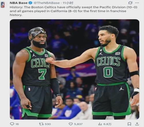 凱爾特人本賽季面對(duì)太平洋賽區(qū)的球隊(duì),豪取10勝0負(fù),完成了橫掃。這是凱爾特人1946年建隊(duì)以來,第一次橫掃整個(gè)太平洋賽區(qū)。這個(gè)賽區(qū)的球隊(duì)大家很熟悉:勇士、快船、湖人、太陽和國王。除了國王之外,其余球隊(duì)實(shí)力并不弱。