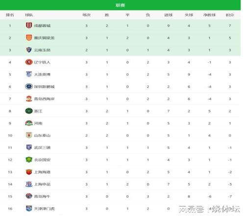 注:中超9隊(duì)在前幾年的比賽中牽扯假賭黑事件,北京國安、浙江隊(duì)、武漢三鎮(zhèn)和上海海港從-5分起步,河南隊(duì)和山東泰山-6分起步,青島海牛-7分起步,上海申花和天津津門虎-10分起步。 第3輪比賽戰(zhàn)罷,西南三強(qiáng)表現(xiàn)不俗,暫居位居積分榜前三。成都蓉城積7分領(lǐng)跑積分榜,云南玉昆積6分緊隨其后,而升班馬重慶銅梁龍1勝2平保持不敗,目前積5分位居第三名。