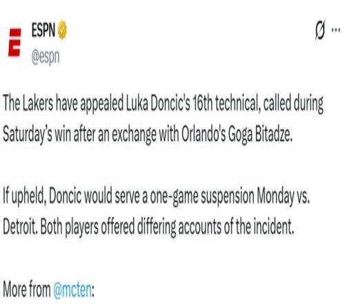 這是東契奇本賽季第16次技術(shù)犯規(guī)。如果這次技犯不予撤銷,按照規(guī)則,他將因?yàn)榧挤笣M16次,在下周二湖人對(duì)陣活塞的比賽中自動(dòng)禁賽一場(chǎng)。