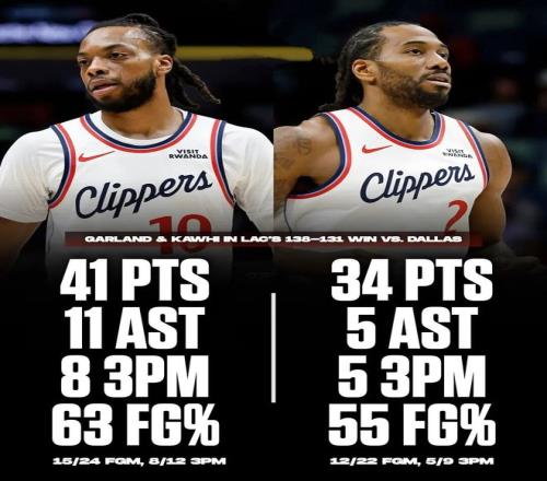 常規(guī)賽,快船客場138-131戰(zhàn)勝獨(dú)行俠。 這場比賽,倫納德的表現(xiàn):全場出戰(zhàn)36分鐘,投籃22中12,三分9中5,罰球5中5,得到34分3籃板5助攻2搶斷1蓋帽。 數(shù)據(jù)上看,倫納德可能不是這場比賽快船最耀眼的——隊(duì)友加蘭全場拿到了41分3籃板11助攻,得分、助攻均為全隊(duì)最高。